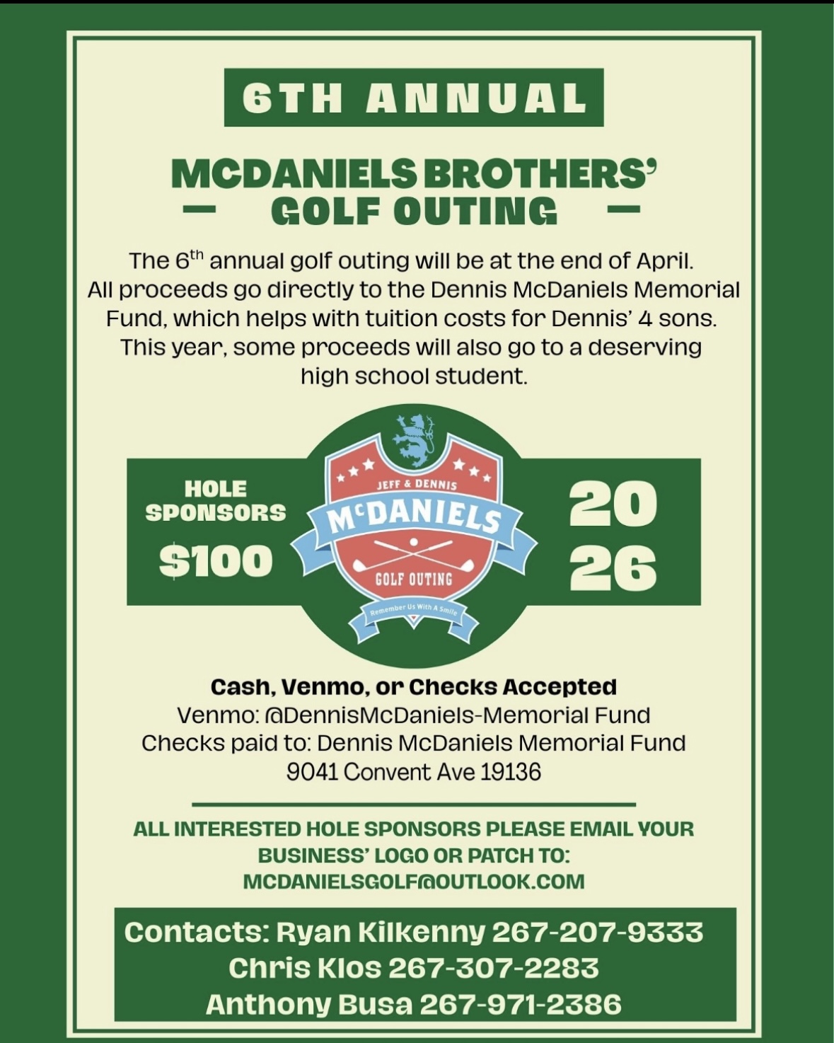 Hole sponsors needed for the 6th Annual McDaniels Brothers Golf Outing. $100/sponsor. Venmo @DennisMcDaniels-MemorialFund